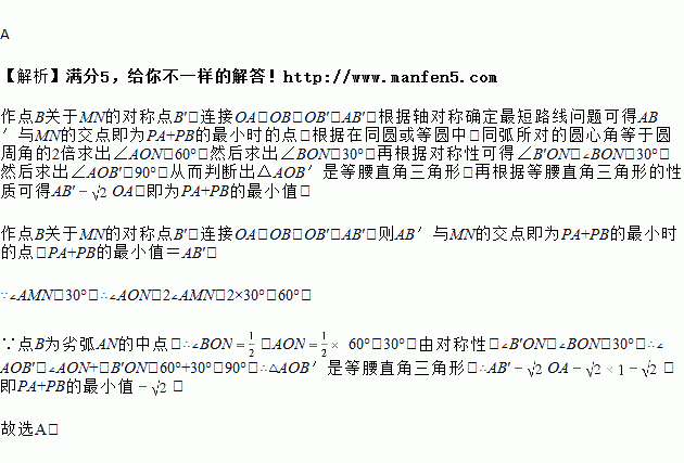 如图,MN是半径为1的⊙O的直径,点A在⊙O上,∠AMN=30°,点B为劣弧AN的中点,点P是直径MN上的一动点,则PA+PB的最小值为( )