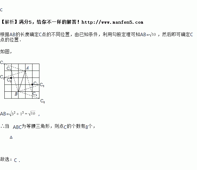 如图,正方形网格中,网格线的交点称为格点,已知A、B是两格点,如果C也是图中的格点,且使得为等腰三角形,则点C的个数有![]()