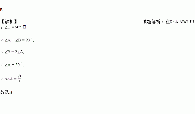 在Rt△ABC中,∠C=90°,若∠B=2∠A,则tanA的值为( )