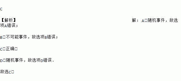C 【解析】【解析】 A、随机事件,故选项A错误; B、不可能事件,故选项B错误; C、正确; D、随机事件,故选项D错误. 故选C.