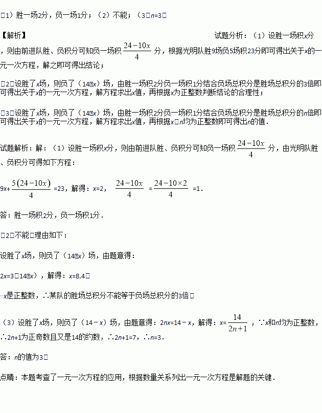 (3) 若某队的负场总积分是胜场总积分的n倍,n为正整数,试求n的值.