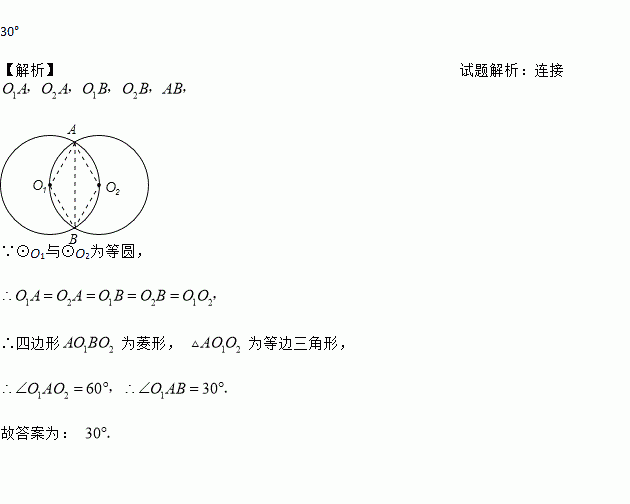 如图所示,两等圆⊙O1和⊙O2相交于A,B两点,且⊙O1过点O2,则∠O1AB的度数是__________.