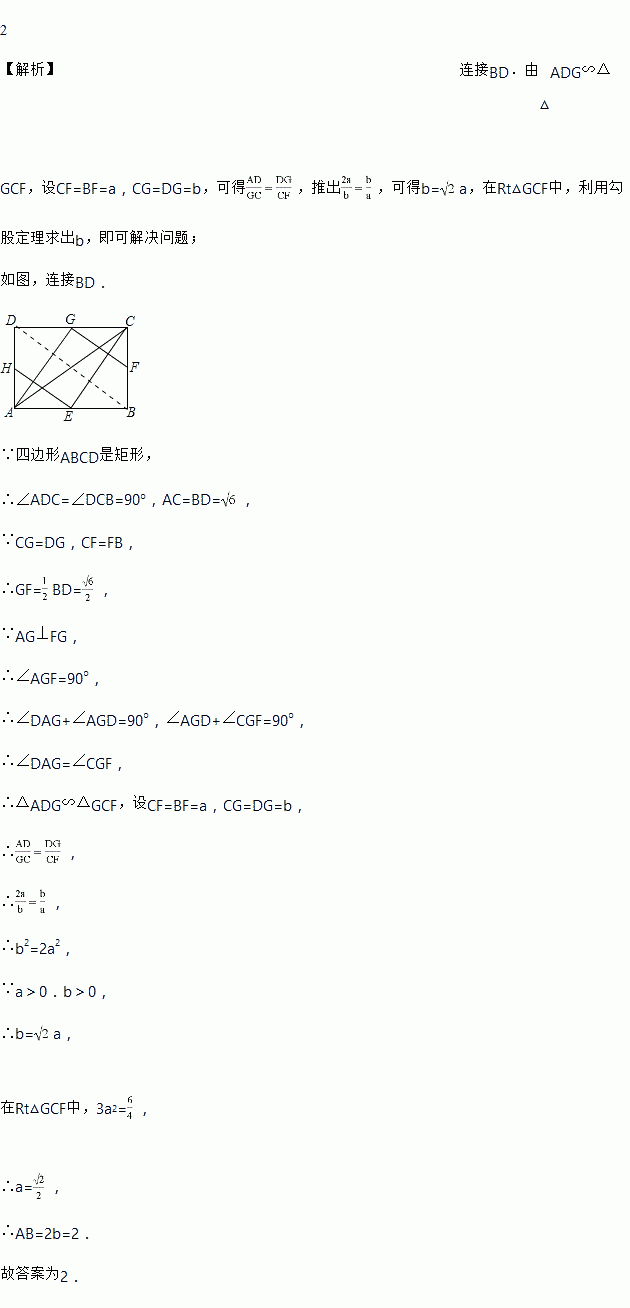 如图,E、F、G、H分别为矩形ABCD的边AB、BC、CD、DA的中点,连接AC、HE、EC,GA,GF.已知AG⊥GF,AC=,则AB的长为__________.