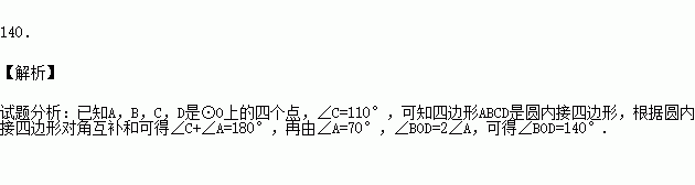 如图,A,B,C,D是⊙O上的四个点,∠C=110°,则∠BOD= 度.
