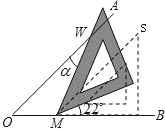 用等腰直角三角板画∠AOB=45°,并将三角板沿OB方向平移到如图所示的虚线处后绕点M逆时针方向旋转22°,则三角板的斜边与射线OA的夹角α为________度.