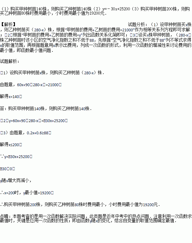 (3)据统计,甲乙两种树苗每株对空气的净化指数分别为0.2和0.6,如何购买甲乙两种树苗才能保证该小区的空气净化指数之和不低于88而且费用最低?并请你求出最低费用的是多少元?