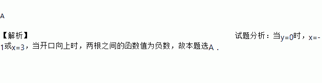 A 【解析】试题分析:当y=0时,x=-1或x=3,当开口向上时,两根之间的函数值为负数,故本题选A.