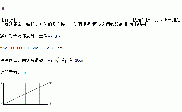 如图,长方体的底面边长分别为1cm 和3cm,高为6cm.如果用一根细线从点A开始经过4个侧面缠绕一圈到达点B,那么所用细线最短需要_____cm.