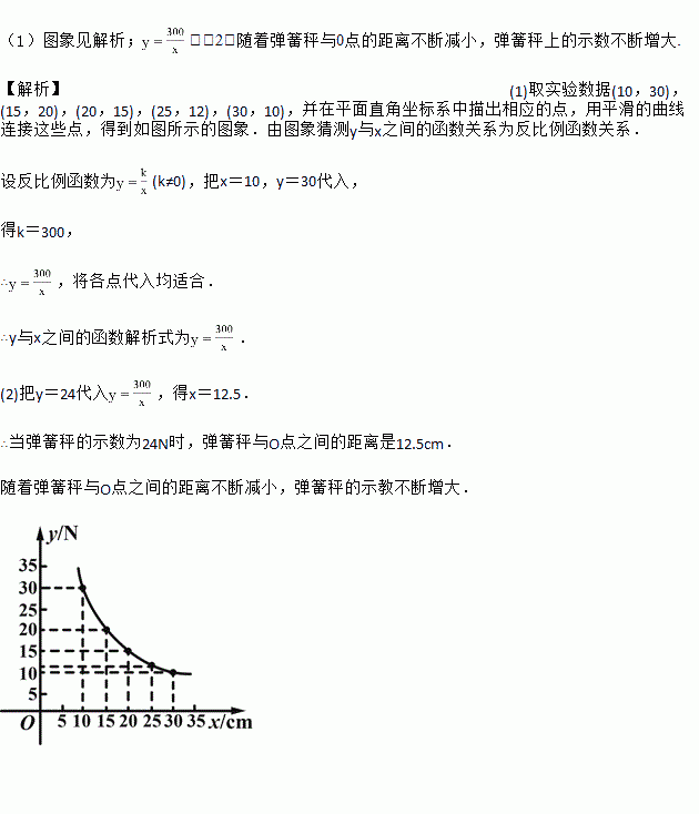 (1)把上表中x,y的各组对应值作为点的坐标,在坐标系中描出相应的点,用平滑曲线连接这些点并观察所得的图象,猜测y(N)与x(cm)之间的函数关系,并求出函数关系式;