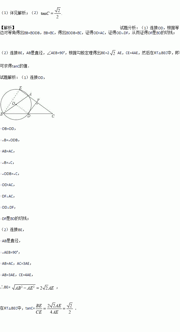 如图,△ABC中,AB=AC,以AB为直径的⊙O与BC相交于点D,与CA的延长线相交于点E,过点D作DF⊥AC于点F.