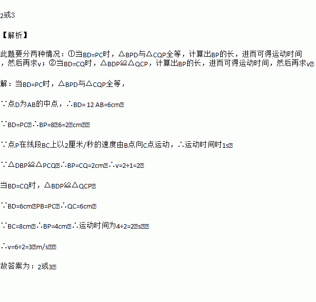 △ABC中,AB=AC=12厘米,∠B=∠C,BC=8厘米,点D为AB的中点.如果点P在线段BC上以2厘米/秒的速度由B点向C点运动,同时,点Q在线段CA上由C点向A点运动.若点Q的运动速度为v厘米/秒,则当△BPD与△CQP全等时,v的值为_____.