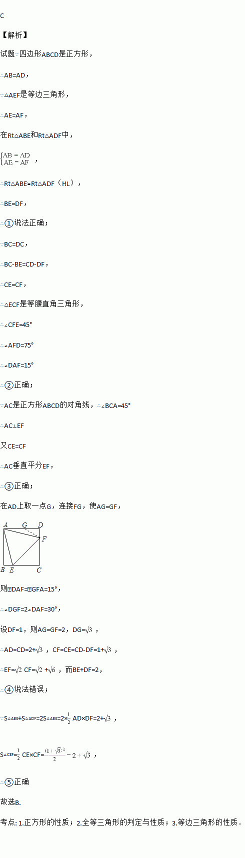 如图,正方形ABCD中,点E、F分别在BC、CD上,△AEF是等边三角形,连接AC交EF于G,下列结论:①BE=DF;②∠DAF=15°,③AC垂直平分EF,④BE+DF=EF,⑤S△AEC=S△ABC,其中正确结论有( )个.