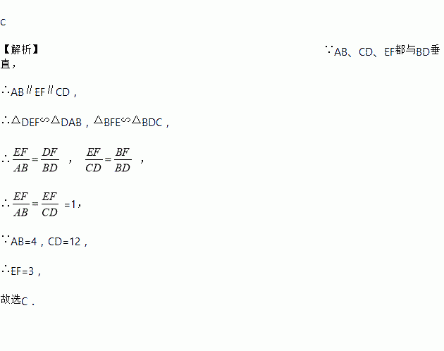 C 【解析】∵AB、CD、EF都与BD垂直, ∴AB∥EF∥CD, ∴△DEF∽△DAB,△BFE∽△BDC, ∴ , , ∴=1, ∵AB=4,CD=12, ∴EF=3, 故选C.