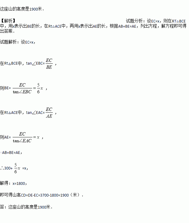 如图,某飞机于空中探测某座山的高度,在点A处飞机的飞行高度是AF=3700米,从飞机上观测山顶目标C的俯角是45°,飞机继续以相同的高度飞行300米到B处,此时观测目标C的俯角是50°,求这座山的高度CD.