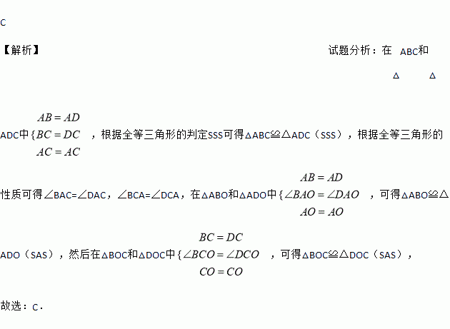 如图,在四边形ABCD中,AB=AD,CB=CD,若连接AC、BD相交于点O,则图中全等三角形共有( )