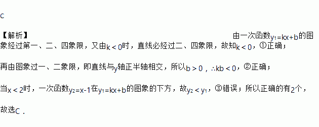 C 【解析】由一次函数y1=kx+b的图象经过第一、二、四象限,又由k<0时,直线必经过二、四象限,故知k<0,①正确; 再由图象过一、二象限,即直线与y轴正半轴相交,所以b>0,∴kb<0,②正确; 当x<2时,一次函数y2=x-1在y1=kx+b的图象的下方,故y2<y1,③错误;所以正确的有2个, 故选C.