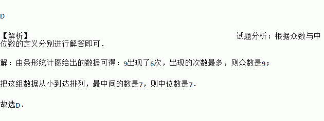 D 【解析】试题分析:根据众数与中位数的定义分别进行解答即可. 【解析】 由条形统计图给出的数据可得:9出现了6次,出现的次数最多,则众数是9; 把这组数据从小到达排列,最中间的数是7,则中位数是7. 故选D.
