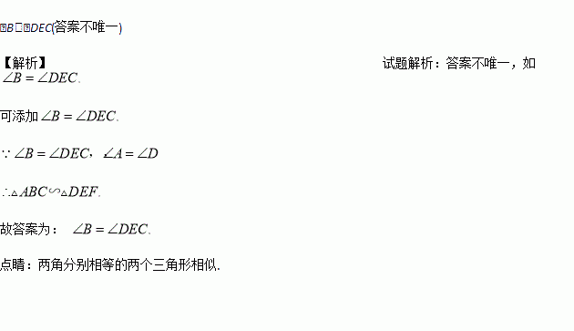 如图,已知点B,E,C,F在同一条直线上,∠A=∠D,要使△ABC∽△DEF,还需添加一个条件,你添加的条件是____________(只需写一个条件,不添加辅助线和字母).