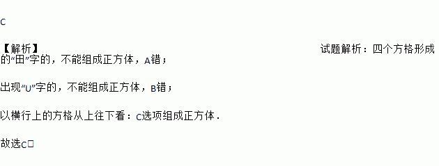 C 【解析】试题解析:四个方格形成的“田”字的,不能组成正方体,A错; 出现“U”字的,不能组成正方体,B错; 以横行上的方格从上往下看:C选项组成正方体. 故选C.