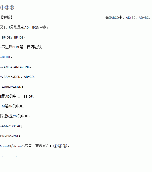 如图,在平行四边形ABCD中,E、F分别是边AD、BC的中点,AC分别交BE、DF于点M、N. 给出下列结论:①△ABM≌△CDN;②AM=