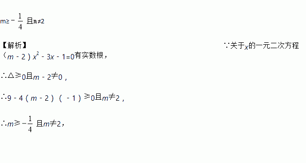 m≥﹣且m≠2 【解析】∵关于x的一元二次方程(m﹣2)x2﹣3x﹣1=0有实数根, ∴△≥0且m﹣2≠0, ∴9﹣4(m﹣2)(﹣1)≥0且m≠2, ∴m≥且m≠2,