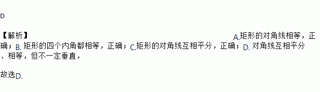 D 【解析】A.矩形的对角线相等,正确;B. 矩形的四个内角都相等,正确;C.矩形的对角线互相平分,正确;D. 对角线互相平分、相等,但不一定垂直, 故选D.