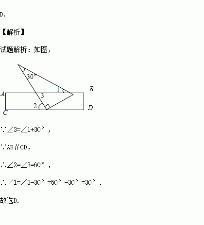 如图,将一块含有30°角的直角三角板的两个顶点放在矩形直尺的一组对边上.如果∠2=60°,那么∠1的度数为( )