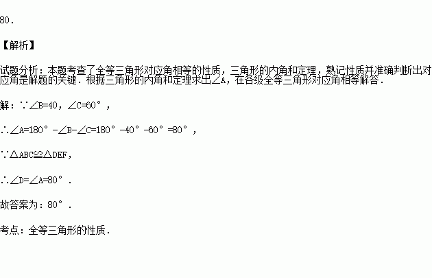 若△ABC≌△DEF,∠B=40°,∠C=60°,则∠D= °.