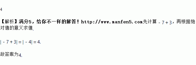 计算:|-7+3|=________.