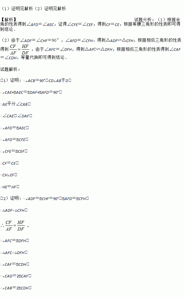 △ABC中,∠ACB=90°,CD⊥AB于D,AE平分∠CAB交CD于F,CH⊥EF于H,连接DH,求证:(1)EH=FH;