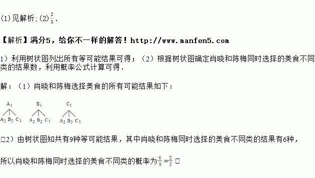 (1)用画树状图或列表法表示肖晓和陈梅选择美食的所有可能结果;