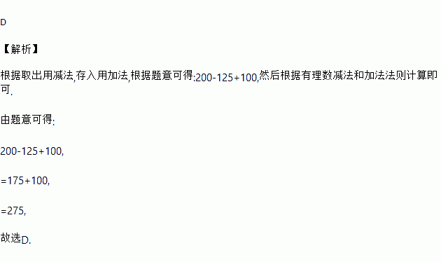 存折中有存款200元,取出125元,又存入100元,存折中还有( )