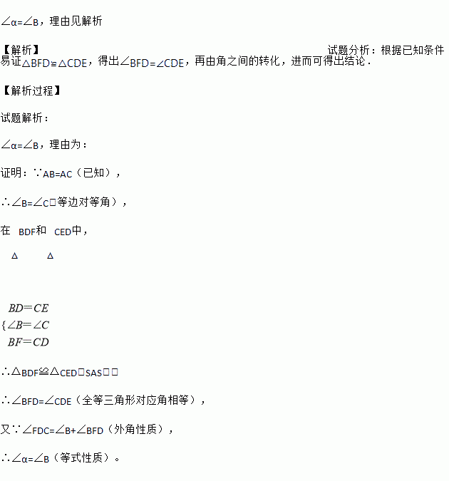 如图,在△ABC中,AB=AC,BF=CD,BD=CE,∠FDE=α,探索α与∠B的关系。