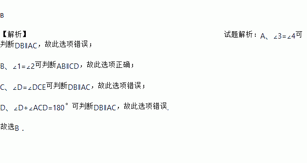 B 【解析】试题解析:A、∠3=∠4可判断DB∥AC,故此选项错误; B、∠1=∠2可判断AB∥CD,故此选项正确; C、∠D=∠DCE可判断DB∥AC,故此选项错误; D、∠D+∠ACD=180°可判断DB∥AC,故此选项错误. 故选B.