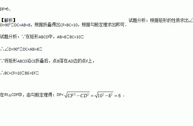 如图,在矩形ABCD中,AB=8,BC=10,E是AB上一点,将矩形ABCD沿CE折叠后,点B落在AD边的点F上,求DF的长为多少?