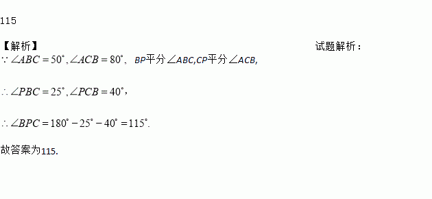 如图,在△ABC中,∠ABC=50°,∠ACB=80°,BP平分∠ABC, CP平分∠ACB,则∠BPC的大小是_____度.