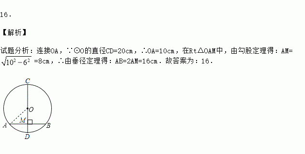 如图,⊙O的直径CD=20cm,AB是⊙O的弦,AB⊥CD,垂足为M,若OM=6cm,则AB的长为 cm.