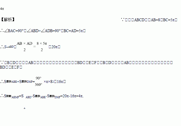 如图,已知矩形ABCD中,AB=8,BC=.分别以B、D为圆心,AB为半径画弧,两弧分别交对角线BD于点E、F,则图中阴影部分的面积为__________.