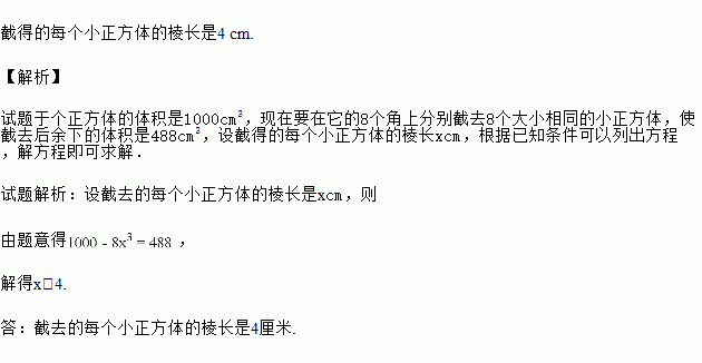 已知一个正方体的体积是1 000 cm3,现在要在它的8个角上分别截去8个大小相同的小正方体,使得截去后余下的体积是488 cm3,问截得的每个小正方体的棱长是多少?