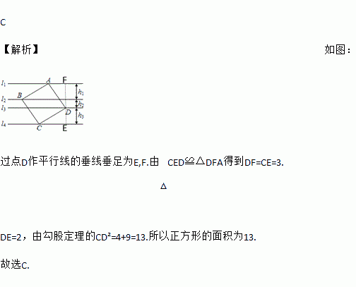 如图,正方形ABCD的四个顶点分别在四条平行线l1、l2、l3、l4上,这四条直线中相邻两条之间的距离依次为h1、h2、h3.若h1=2,h2=1,则正方形ABCD的面积为( )