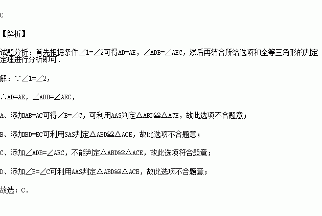 A.AB=AC B.DB=EC C.∠ADB=∠AEC D.∠B=∠C