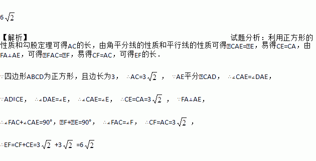 如图,正方形ABCD边长为3,连接AC,AE平分∠CAD,交BC的延长线于点E,FA⊥AE,交CB延长线于点F,则EF的长为__________.