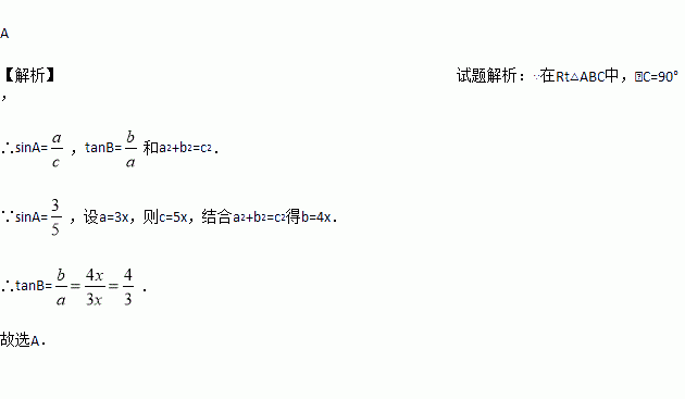 已知在Rt△ABC中,∠C=90°,sinA=,则tanB的值为( )