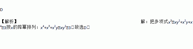 D 【解析】【解析】 把多项式x3﹣xy2+x2y+x4﹣3按x的降幂排列:x4+x3+x2y﹣xy2﹣3.故选D.