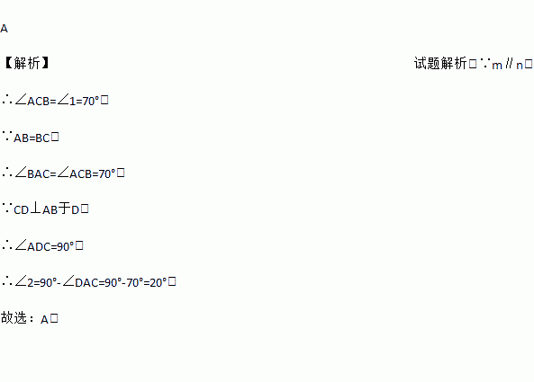 如图,直线m∥n,点A在直线m上,点B,C在直线n上,AB=BC,∠1=70°,CD⊥AB于D,∠2等于 ( )