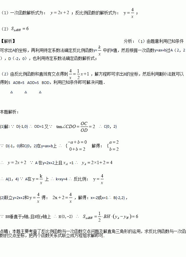 (k≠0)的图象相交于A、B两点,与y轴交于点C,与x轴交于点D,点D的坐标为(-1,0),点A的横坐标是1,tan∠CDO=2,过点B作BH⊥y轴于点H,连接 AH.