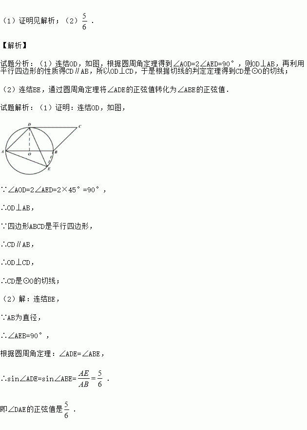 如图,四边形ABCD是平行四边形,以AB为直径的⊙0经过点D,E是⊙O上一点,且∠AED=45°,