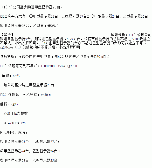 ij¹«Ë¾¾ö¶¨´Ó³§¼Ò¹º½ø¼×¡¢ÒÒÁ½ÖÖ²»Í¬ÐͺŵÄÏÔʾÆ÷¹²50̨£¬¹º½øÏÔʾÆ÷µÄ×ܽð¶î²»³¬¹ý77000Ôª£¬ÒÑÖª¼×¡¢ÒÒÐͺŵÄÏÔʾÆ÷¼Û¸ñ·Ö±ðΪ1000Ôª/̨¡¢2000Ôª/̨.