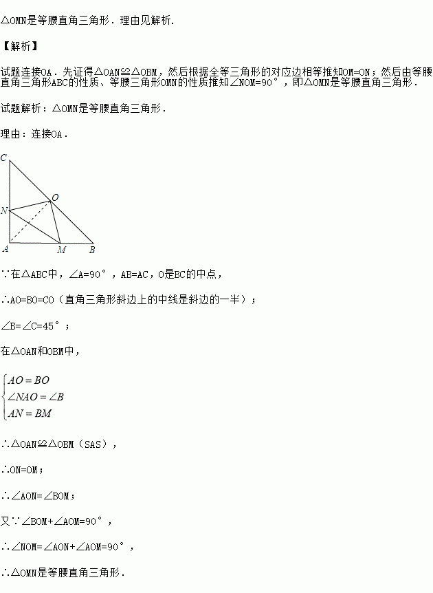 如图,在△ABC中,∠A=90°,AB=AC,O是BC的中点,如果在AB和AC上分别有一个动点M、N在移动,且在移动时保持AN=BM,请你判断△OMN的形状,并说明理由.