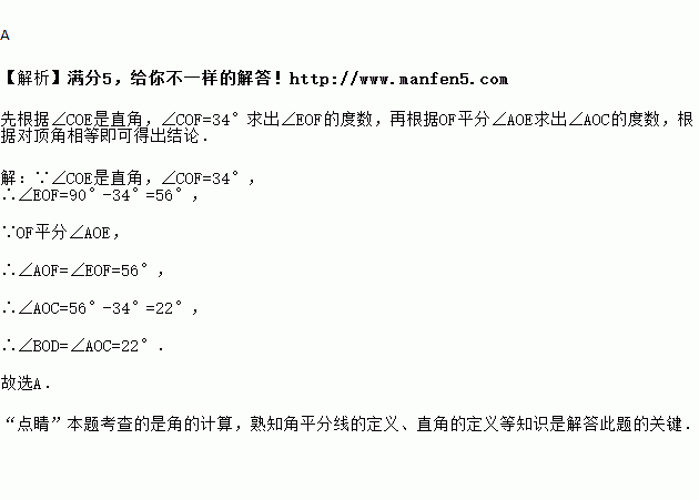 如图,已知直线和相交于点,∠COE是直角,OF平分∠AOE,∠COF=34°,则∠BOD的大小为( )